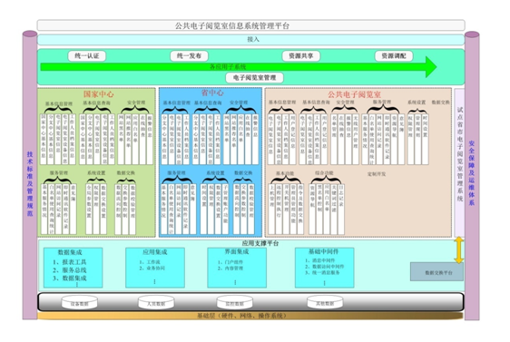 从下至上,第一层次是公共电子阅览室管理信息系统的基础设施层;第二层为公共电子阅览室管理信息系统数据层;第三层为国资监管应用支撑服务层;第四层为应用层,将在应用支撑服务层之上定制开发各管理业务应用;第五层为表现层,包括公共电子阅览室相关网站,实现文化部内数据共享、信息发布、业务协同、知识管理等;第六层为接入层,用户通过浏览器等方式接入该系统。
